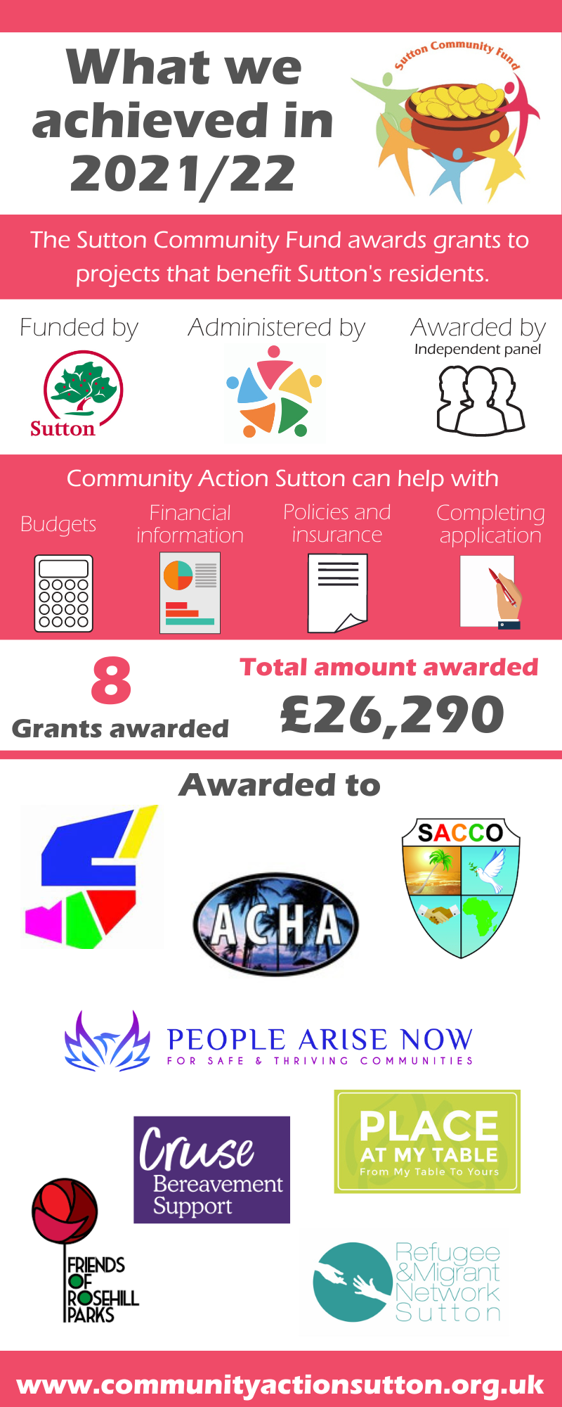 The Sutton Community Fund is a grant funding programme financed by Sutton Council and administered by Community Action Sutton. Each application is assessed, and grants are awarded by an independent panel. Please ensure that you read through the guidance carefully before completing the online google form.